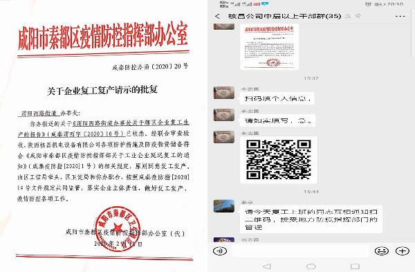 219日,核昌公司在不斷加強新型冠狀病毒疫情防控工作的基礎上。根據集團公司復工復產相關要求,經咸陽市秦都區疫情防控指揮部辦公室批準,結合公司自身實際情況,自219日起恢復工作與生產并做好咸陽市疫情企業復工復產登記工作。
